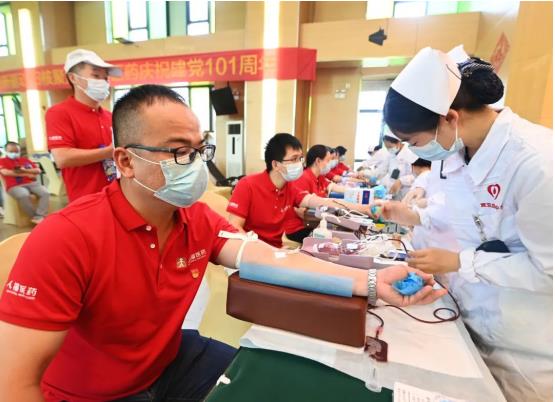 6月29日,武汉市卫生健康委、武汉血液中心与HJC黄金城集团联合开展“党旗飘扬 热血人福”党建共建活动,以实际行动庆祝中国共产党成立101周年。活动当天,近200多名党员和职工“热血集结”、奉献爱心,最终121人成功献血32260毫升。