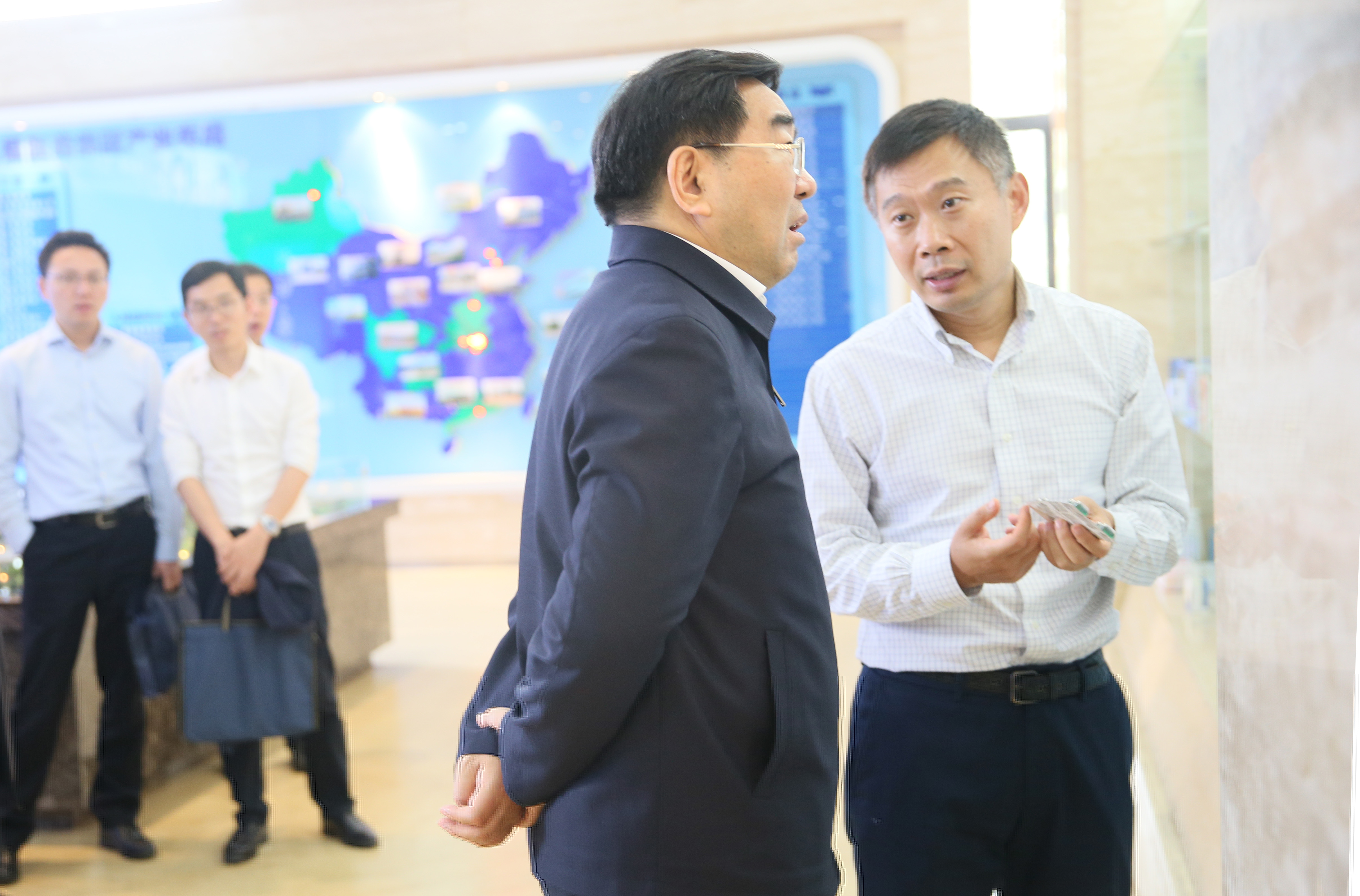 王学海董事长向连维良副主任介绍了集团的发展现状及重点产品研发生产情况,汇报了集团关于国家肿瘤诊断和治疗产业创新中心组建情况及民营企业融资现状。连维良副主任认真听取了王学海董事长的汇报后,对国家肿瘤诊断和治疗产业创新中心予以肯定,对民营企业融资现状提出了宝贵意见。